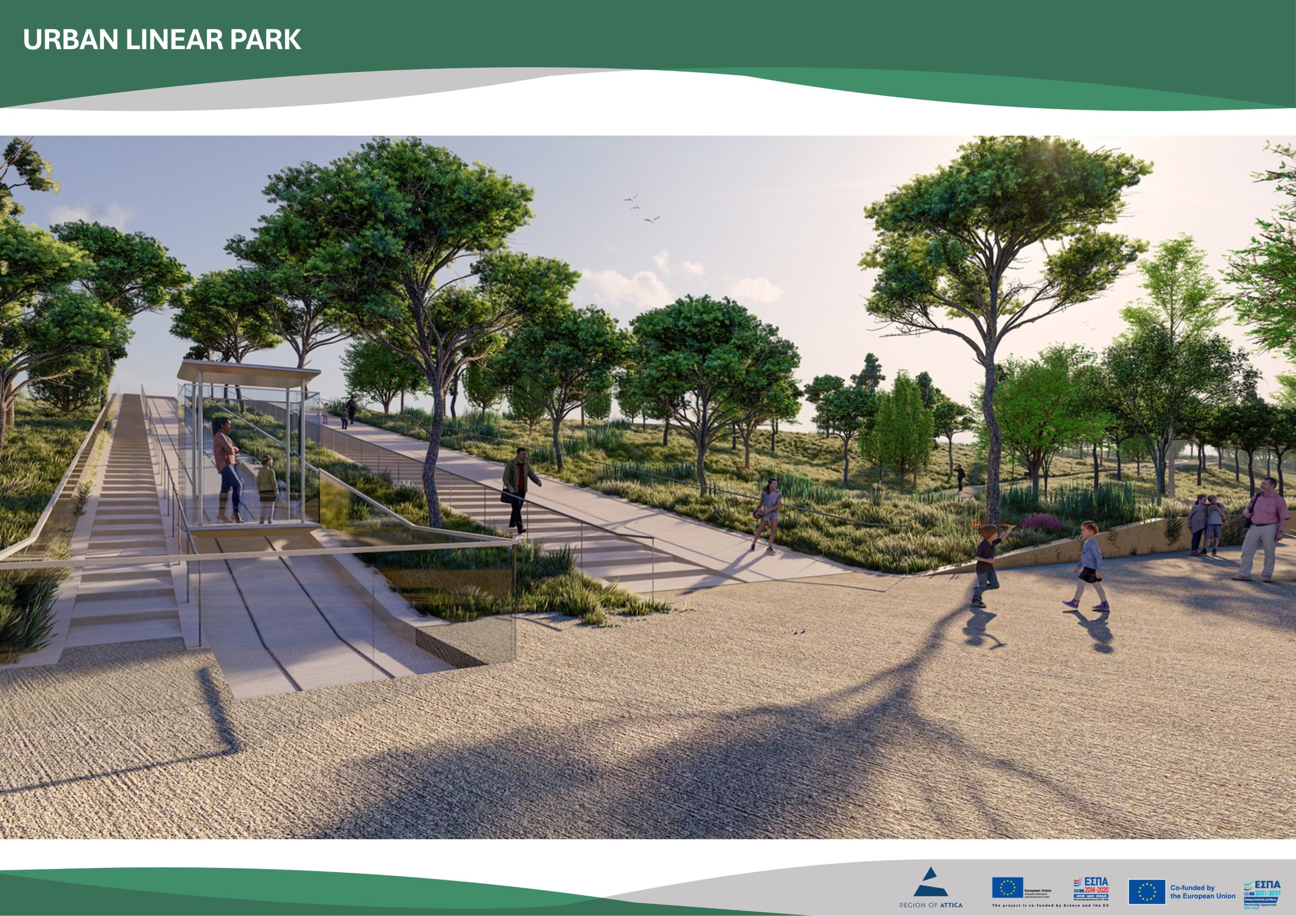 - Ταυτόχρονα, ένας «ζωντανός» πράσινος περίπατος στο δώμα των γραμμικών κτιρίων, θα συνδέει το Πάρκο με την Εσπλανάδα και το κλειστό του Tae Kwon Do