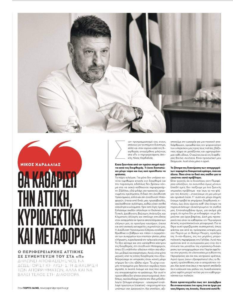 Σε σειρά σημαντικών ζητημάτων, όπως η εξυγίανση των υπηρεσιών της Περιφέρειας και οι θεσμικές μεταρρυθμίσεις που απαιτούνται για την ενίσχυση του ρόλου της μητροπολιτικότητας και της αυτοδιοικησης αναφέρθηκε ο περιφερειάρχης Αττικής Νίκος Χαρδαλιάς σε συνέντευξή του στην εφημερίδα «Παραπολιτικά».