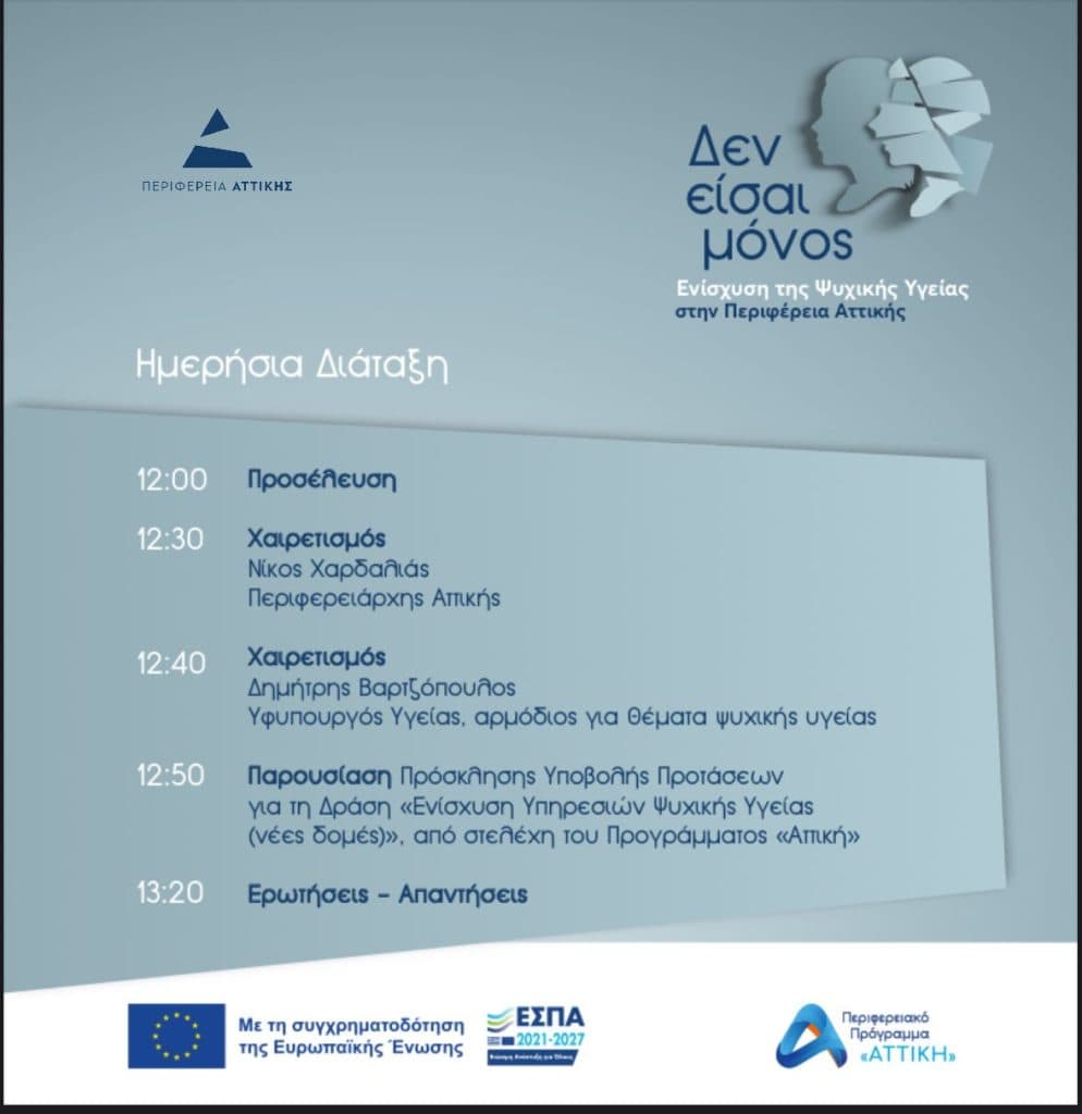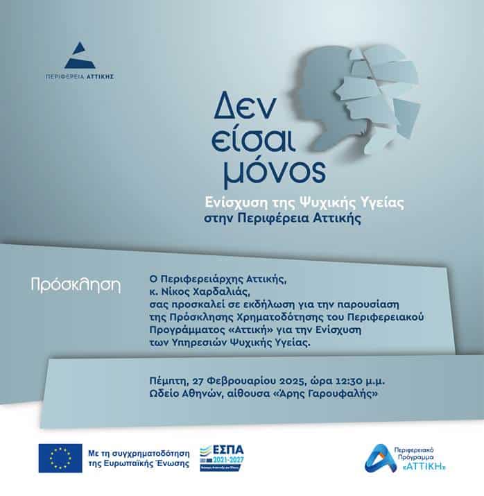 O Περιφερειάρχης Νίκος Χαρδαλιάς θα παρουσιάσει το νέο πρόγραμμα της Περιφέρειας Αττικής για την ενίσχυση δομών Ψυχικής Υγείας, ύψους 18,3 εκατ. ευρώ, αύριο Πέμπτη 27 Φεβρουαρίου και ώρα 12.30 στο Ωδείο Αθηνών (Ρηγίλλης &, Βασ. Γεωργίου B 17-19 – αίθουσα «Άρης Γαρουφαλής»).