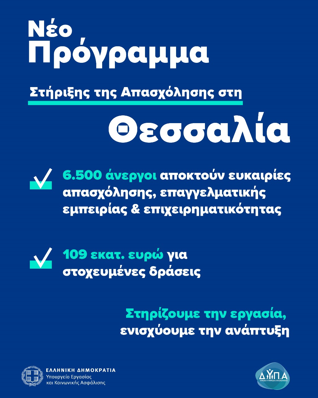 Συγκεκριμένα, πρόκειται για τρία σημαντικά προγράμματα που έχουν ως στόχο τη δημιουργία νέων θέσεων εργασίας, την παροχή επαγγελματικής εμπειρίας και την ενθάρρυνση της επιχειρηματικότητας που πραγματοποιεί η Δημόσια Υπηρεσία Απασχόλησης και αφορούν 6.500 ανέργους στην Περιφέρεια Θεσσαλίας.