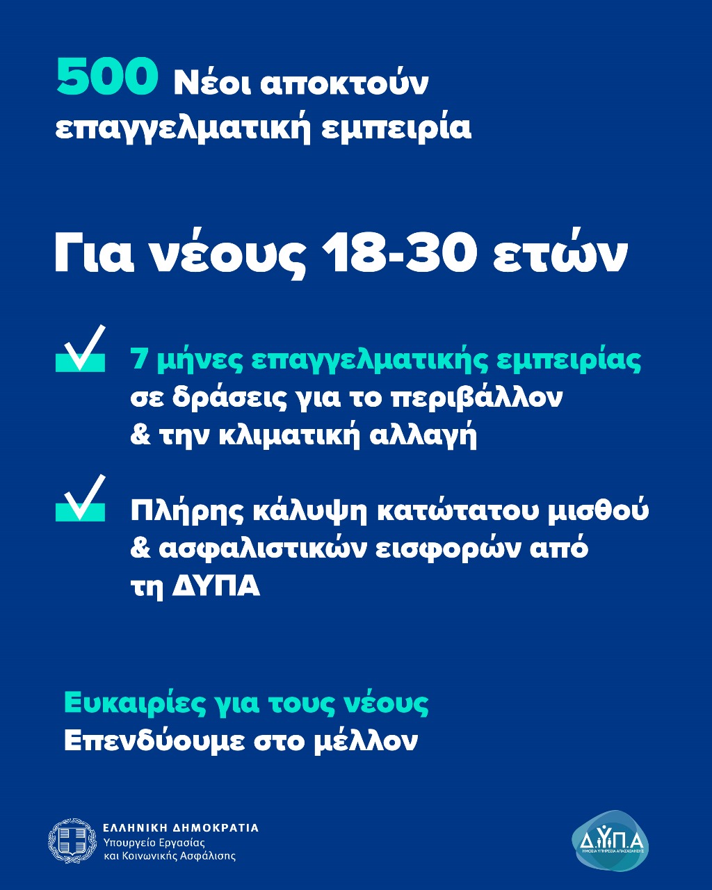 3.Πρόγραμμα απόκτησης επαγγελματικής εμπειρίας 500 νέων ανέργων σε δράσεις αντιμετώπισης των συνεπειών της κλιματικής αλλαγής