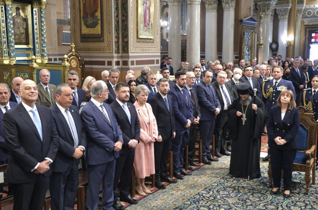 Εντός του μητροπολιτικού ναού, την πολιτειακή και πολιτική ηγεσία υποδέχτηκε ο Αρχιεπίσκοπος Αθηνών και Πάσης Ελλάδος κ.κ. Ιερώνυμος, ο οποίος χοροστάτησε στη δοξολογία.