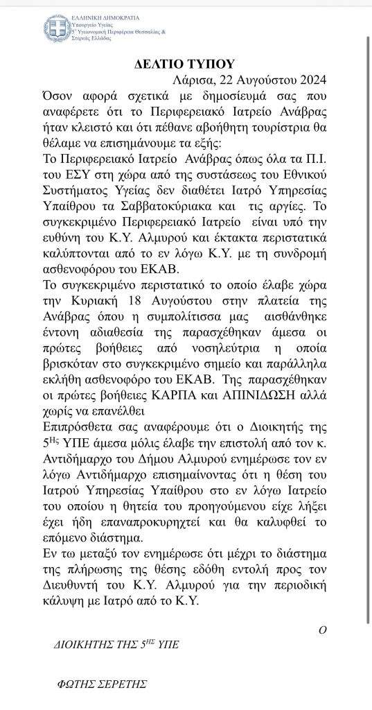 Ο κ. Αντιδήμαρχος Ανάβρας κατήγγειλε στην αρχή, «ότι μία τουρίστρια πέθανε από ανακοπή στην περιοχή του, διότι δεν υπήρχε γιατρός υπαίθρου στο Περιφερειακό Ιατρείο Ανάβρας»