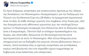 Ως προς διάφορες αναρτήσεις και ανακοινώσεις σχετικά με την οδηγία της διοικήσεως του Νοσοκομείου «Ευαγγελισμός» για την διεξαγωγή του Τελικού του Conference Cup στις 29 Μαΐου τα πραγματικά περιστατικά είναι τα εξής: Σε κάθε επίσημο γεγονός που συμβαίνει στην Χώρα μας, από την διοργάνωση ενός αθλητικού γεγονότος έως την υποδοχή ξένων ηγετών το Νοσοκομείο Αναφοράς που δηλώνεται από τις Ελληνικές Αρχές είναι ο Ευαγγελισμός. Πάντοτε δηλ οι επίσημοι προσκεκλημένοι της Χώρας, εάν απαιτηθεί, δηλώνεται ότι θα εξυπηρετούνται κατά προτεραιότητα σε αυτό το Νοσοκομείο. Μία τέτοια δέσμευση είναι υποχρεωτική για να διεξαχθεί ένα γεγονός τέτοιου βεληνεκούς όπως ο τελικός. Κατά συνέπεια όλες οι σχετικές αναρτήσεις και αντιδράσεις κυρίως από βουλευτές που στο παρελθόν έχουν συμμετάσχει σε Κυβέρνηση είναι λαϊκίστικες και υποκριτικές.