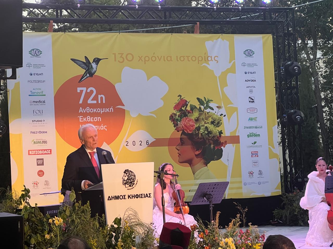 Στον χαιρετισμό του, ο Υφυπουργός τόνισε ότι η Ανθοκομική Έκθεση της Κηφισιάς είναι ένας ιστορικός θεσμός, βαθιά συνδεδεμένος με την άνοιξη, την πόλη της Κηφισιάς και ευρύτερα την Αττική, τη φύση, το πράσινο και την ποιότητα ζωής.