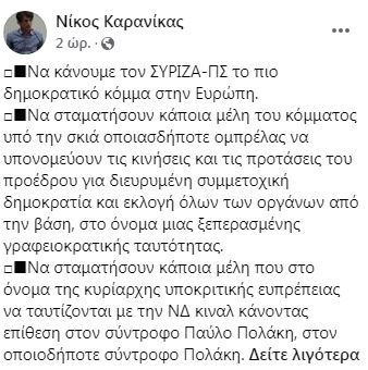 Μάλιστα, ο κ. Καρανίκας λαμβάνει ανοιχτά θέση υπέρ του πρώην Αναπληρωτή Υπουργού Υγείας και Βουλευτή του ΣΥΡΙΖΑ-ΠΣ, Παύλου Πολάκη, αναφέροντας πως πρέπει «να σταματήσουν κάποια μέλη που στο όνομα της κυρίαρχης υποκριτικής ευπρέπειας να ταυτίζονται με την ΝΔ ΚΙΝΑΛ κάνοντας επίθεση στον σύντροφο Παύλο Πολάκη, στον οποιοδήποτε σύντροφο Πολάκη».