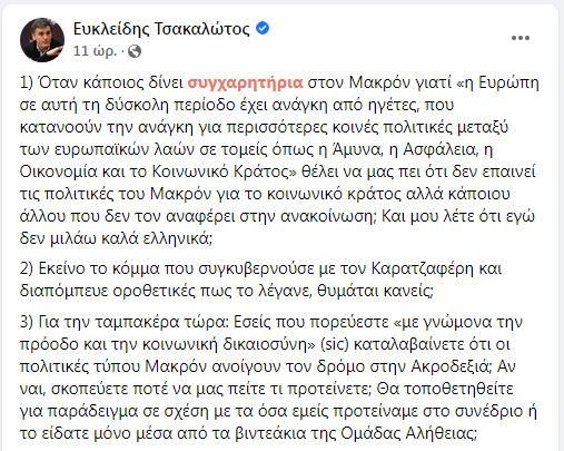 Όλα ξεκίνησαν από την ανάρτηση του Ευκλείδη Τσακαλώτου στο Facebook, στην οποία δήλωσε ότι δεν έχει κατανοήσει το αποτέλεσμα των εκλογών της Γαλλίας, που ανέδειξαν νικητή ξανά τον Εμανουέλ Μακρόν.