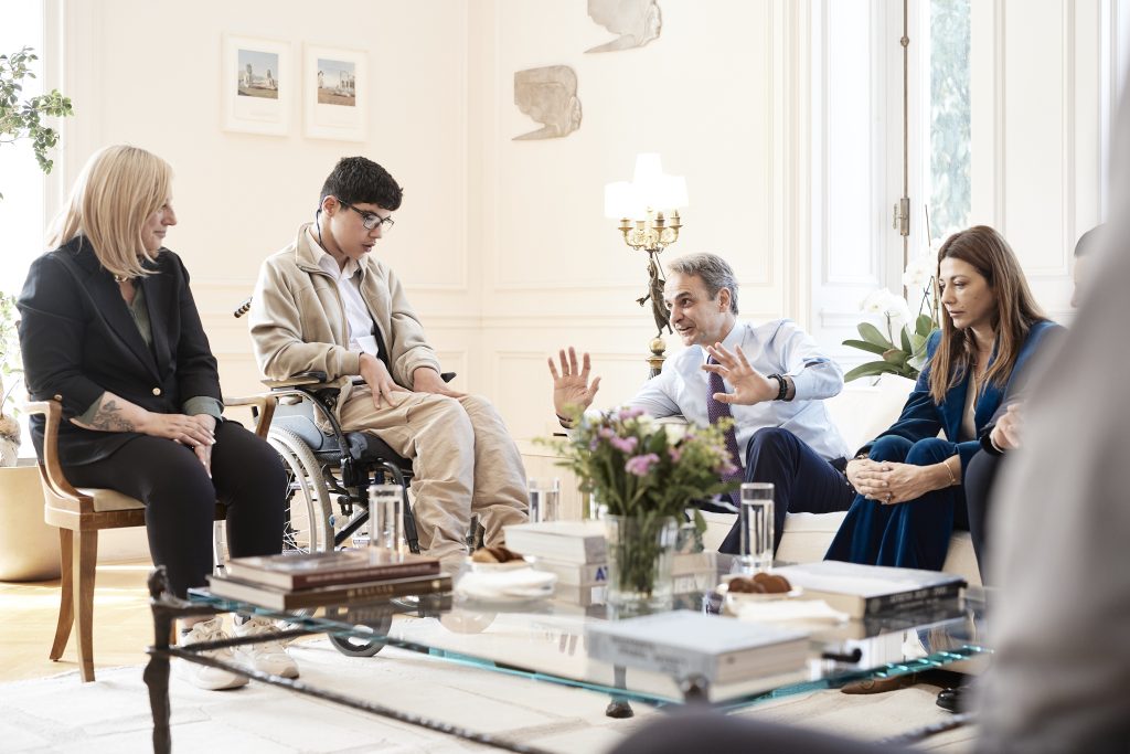 Ο Πρωθυπουργός Κυριάκος Μητσοτάκης συναντήθηκε σήμερα στο Μέγαρο Μαξίμου με τον μαθητή της Β’ Γυμνασίου του Ειδικού Γυμνασίου-Λυκείου Αθηνών στην Ηλιούπολη Παναγιώτη, ο οποίος απέστειλε πρόσφατα επιστολή στον Πρωθυπουργό ζητώντας τη συνδρομή του στην αναβάθμιση των εγκαταστάσεων του σχολείου και των παρεχόμενων υπηρεσιών για παιδιά με αναπηρία.