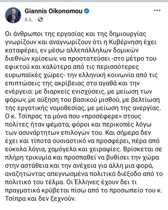 «Οι άνθρωποι της εργασίας και της δημιουργίας γνωρίζουν και αναγνωρίζουν ότι η κυβέρνηση έχει καταφέρει, εν μέσω αλλεπάλληλων δομικών διεθνών κρίσεων, να προστατεύσει -στο μέτρο του εφικτού και καλύτερα από τις περισσότερες ευρωπαϊκές χώρες- την ελληνική κοινωνία από τις επιπτώσεις της ακρίβειας στα αγαθά και την ενέργεια: με διαρκείς ενισχύσεις, με μείωση των φόρων, με αύξηση του βασικού μισθού, με βελτίωση της εργατικής νομοθεσίας, με μείωση της ανεργίας» ανέφερε σε ανάρτησή του στο διαδίκτυο ο Γιάννης Οικονόμου.