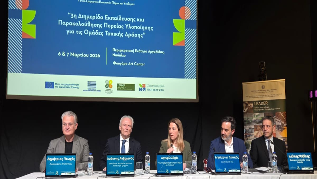 Με επιτυχία πραγματοποιήθηκε στο Ναύπλιο, στις 6 και 7 Μαρτίου 2026, η 3η Διημερίδα Εκπαίδευσης και Παρακολούθησης Πορείας Υλοποίησης για τις Ομάδες Τοπικής Δράσης, που διοργάνωσε η Γενική Γραμματεία Ενωσιακών Πόρων και Υποδομών του Υπουργείου Αγροτικής Ανάπτυξης και Τροφίμων με τη συμβολή του Εθνικού Δικτύου ΚΑΠ.