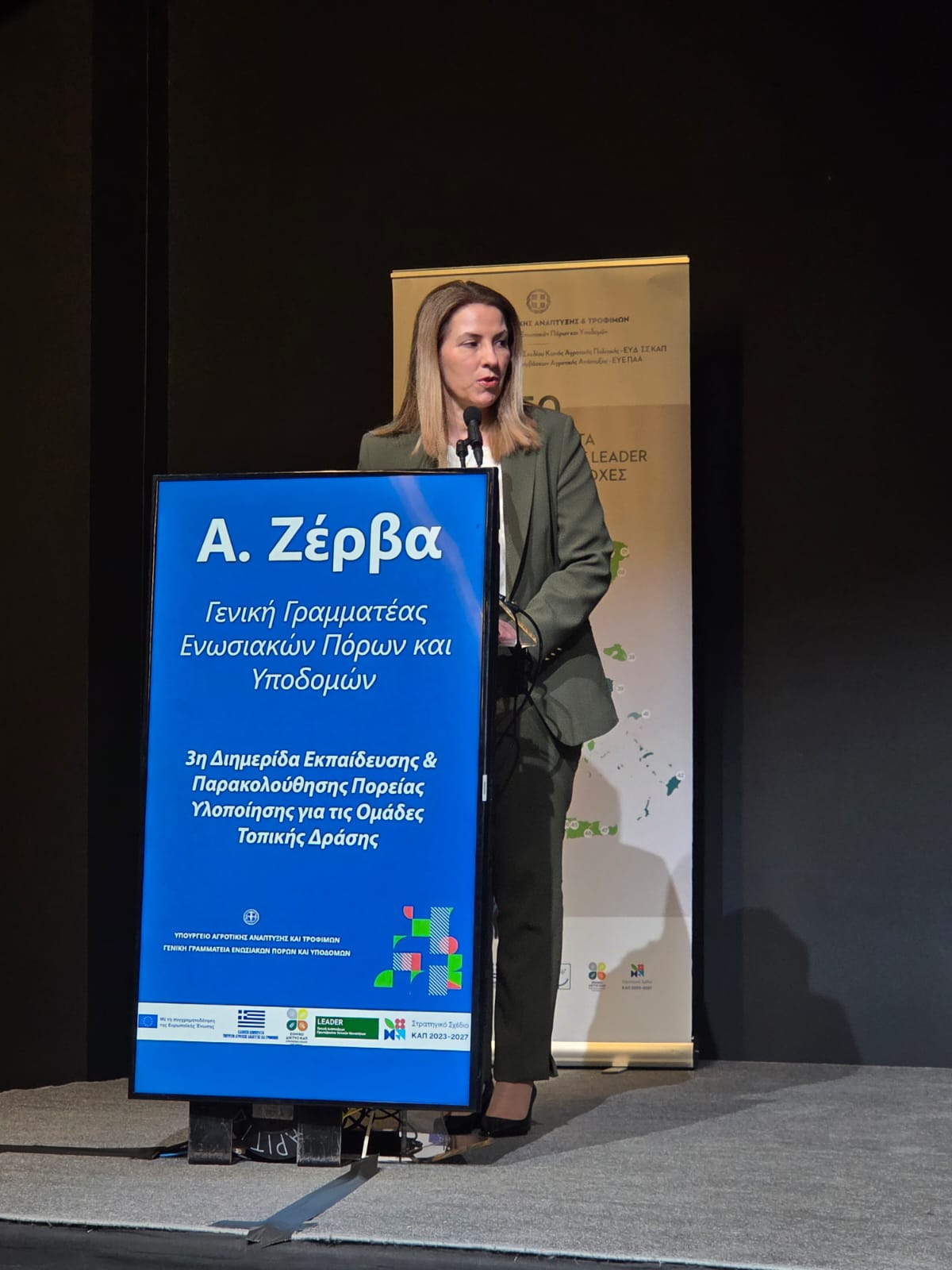 Εναρκτήρια ομιλία πραγματοποίησε η Γενική Γραμματέας Ενωσιακών Πόρων και Υποδομών κ. Αργυρώ Ζέρβα, η οποία αναφέρθηκε στον απολογισμό της εφαρμογής του LEADER στο Πρόγραμμα Αγροτικής Ανάπτυξης 2014–2022 και στη μετάβαση στη νέα περίοδο του Στρατηγικού Σχεδίου της ΚΑΠ. Όπως υπογράμμισε, το LEADER έχει εξελιχθεί σε ένα ολοκληρωμένο μοντέλο τοπικής ανάπτυξης που ενισχύει την επιχειρηματικότητα, τη συνεργασία μεταξύ δημόσιου και ιδιωτικού τομέα και την κοινωνική συνοχή στις αγροτικές περιοχές.
