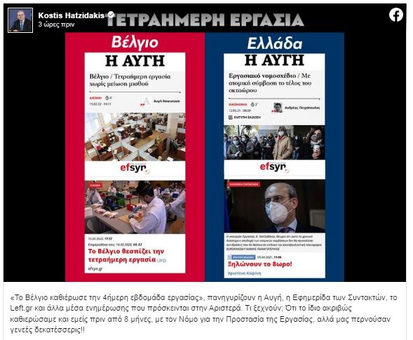 Με ανάρτηση του ο υπουργός Εργασίας και Κοινωνικών Υποθέσεων αναφέρεται στα δημοσιεύματα που «πανηγυρίζουν», όπως σημειώνει, για την απόφαση της κυβέρνησης του Βελγίου να προωθήσει την τετραήμερη εβδομάδα εργασίας χωρίς μείωση των αποδοχών μέσω της αναθεώρησης της εργασιακής νομοθεσίας, την οποία επέσπευσε η πανδημία του κορωνοϊού.
