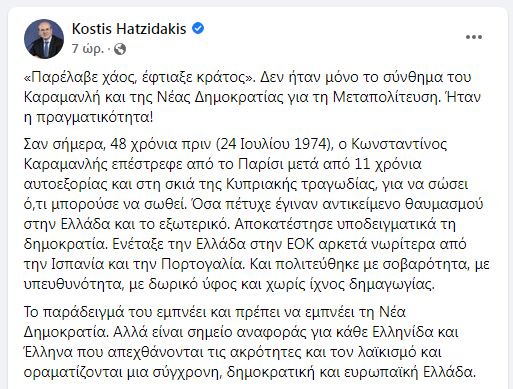 «Σαν σήμερα, 48 χρόνια πριν (24 Ιουλίου 1974), ο Κωνσταντίνος Καραμανλής επέστρεφε από το Παρίσι μετά από 11 χρόνια αυτοεξορίας και στη σκιά της Κυπριακής τραγωδίας, για να σώσει ό,τι μπορούσε να σωθεί. Όσα πέτυχε έγιναν αντικείμενο θαυμασμού στην Ελλάδα και το εξωτερικό. Αποκατέστησε υποδειγματικά τη δημοκρατία. Ενέταξε την Ελλάδα στην ΕΟΚ αρκετά νωρίτερα από την Ισπανία και την Πορτογαλία. Και πολιτεύθηκε με σοβαρότητα, με υπευθυνότητα, με δωρικό ύφος και χωρίς ίχνος δημαγωγίας» σημειώνει.