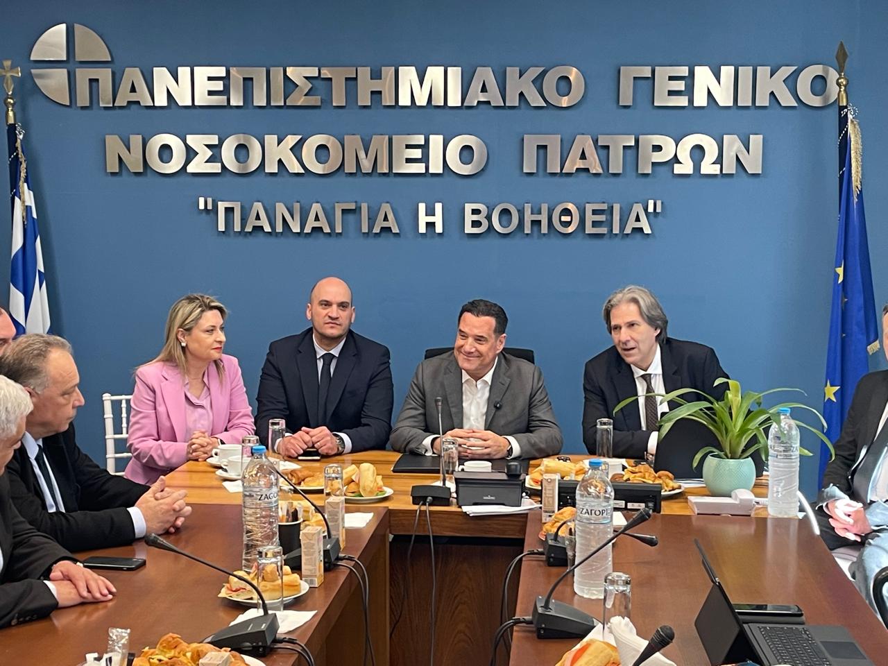 Η σημερινή επίσκεψη του ‘Αδωνη Γεωργιάδη στα νοσηλευτικά ιδρύματα της Πάτρας ξεκίνησε από το πανεπιστημιακό νοσοκομείο, όπου προήδρευσε σε σύσκεψη που πραγματοποιήθηκε στο κτίριο της διοίκησης.