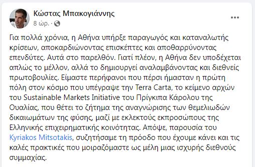«Για πολλά χρόνια, η Αθήνα υπήρξε παραγωγός και καταναλωτής κρίσεων, αποκαρδιώνοντας επισκέπτες και αποθαρρύνοντας επενδύτες. Αυτά στο παρελθόν. Γιατί πλέον, η Αθήνα δεν υποδέχεται απλώς το μέλλον, αλλά το δημιουργεί αναλαμβάνοντας και διεθνείς πρωτοβουλίες. Είμαστε περήφανοι που πέρσι ήμασταν η πρώτη πόλη στον κόσμο που υπέγραψε την Terra Carta, το κείμενο αρχών του Sustainable Markets Initiative του Πρίγκιπα Κάρολου της Ουαλίας, που θέτει το ζήτημα της αναγνώρισης των θεμελιωδών δικαιωμάτων της φύσης, μαζί με εκλεκτούς εκπροσώπους της Ελληνικής επιχειρηματικής κοινότητας. Απόψε, παρουσία του Κυριάκου Μητσοτάκη συζητήσαμε τη πρόοδο που έχουμε κάνει και τις καλές πρακτικές που μοιραζόμαστε ως μέλη μιας ισχυρής διεθνούς συμμαχίας» αναφέρει ο Κώστας Μπακογιάννης στην ανάρτησή του.