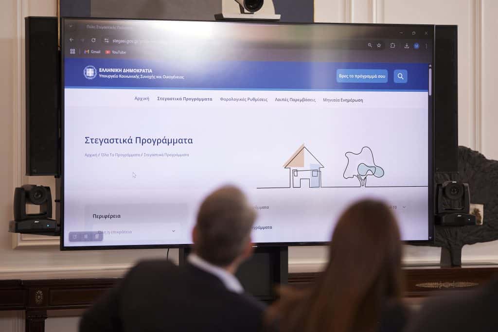 Ο Πρωθυπουργός Κυριάκος Μητσοτάκης προήδρευσε σε σύσκεψη στην οποία παρουσιάστηκε η νέα ψηφιακή πύλη stegasi.gov.gr, όπου οι πολίτες μπορούν εύκολα, με λίγα κλικ, να βρουν όλα τα προγράμματα απόκτησης, ανακαίνισης επισκευής ή αναβάθμισης κατοικίας που ταιριάζουν στο προφίλ τους, όπως και τις επιδοτήσεις, φοροελαφρύνσεις ή διευκολύνσεις που παρέχονται σε ιδιοκτήτες και ενοικιαστές.