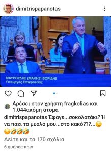 «Ένα μικρό δείγμα από την αισθητική αλλά και την πολιτική συμπεριφορά του νέου υποψηφίου Ευρωβουλευτού του Σύριζα η ανάρτησή του στο Ινσταγκραμ κατά την συζήτηση της Προτάσεως Δυσπιστίας κατά της Κυβερνήσεως… πήρε ένα καρέ από το βίντεο, που βγάζει όποιου είδους γκριμάτσα θέλεις, και έκανε από κάτω αυτό το χυδαίο σχόλιο…αυτή την αισθητική ο Σύριζα την θεωρεί τόσο σπουδαία, που θέλει να την εξάγουμε και στην Ευρώπη…ευτυχώς στις 09 Ιουνίου θα μιλήσει ο Λαός», ήταν η απάντηση του υπουργού Υγείας, κ. Γεωργιάδη, μέσω ανάρτησης του στα μέσα κοινωνικής δικτύωσης.