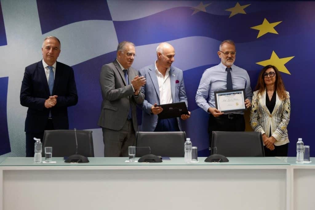 Πραγματοποιήθηκε σήμερα στο Υπουργείο Ανάπτυξης η τελετή βράβευσης του Εθνικού Αστεροσκοπείου Αθηνών από τον Ευρωπαϊκό Οργανισμό Διαστήματος (ESA), παρουσία του Υπουργού Ανάπτυξης Τάκη Θεοδωρικάκου, του Υπουργού Ψηφιακής Διακυβέρνησης Δημήτρη Παπαστεργίου, του Υφυπουργού Ανάπτυξης Σταύρου Καλαφάτη, του Προέδρου του Εθνικού Αστεροσκοπείου Αθηνών Σπύρου Βασιλάκου, της επικεφαλής Μηχανικής και Καινοτομίας Επίγειων Συστημάτων της ESA Mariella Spada, του Γενικού Γραμματέα Τηλεπικοινωνιών και Ταχυδρομείων του Υπουργείου Ψηφιακής Διακυβέρνησης, Κωνσταντίνου Καράντζαλου και πολλών ακόμα μελών της επιστημονικής κοινότητας.