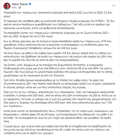 «Τα υπερκέρδη λοιπόν των παραγωγών ηλεκτρικής ενέργειας για το 12μηνο Ιούλιος 2021-Ιούνιος 2022, ανέρχονται σε 2,2 δισ. ευρώ», αναφέρει ο πρόεδρος του ΣΥΡΙΖΑ και προσθέτει: «Ενώ οι άδικες χρεώσεις και τα λεγόμενα ουρανοκατέβατα κέρδη των παραγωγών ΑΠΕ που χρεώθηκαν στους καταναλωτές και αναμένεται να επιστραφούν ως επιδότηση μέσω του Ταμείου Ενεργειακής Μετάβασης, εκτιμώνται σε 2,45 δισ. ευρώ».