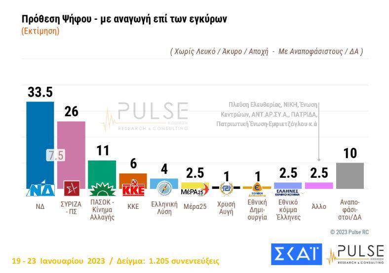 Η Νέα Δημοκρατία προηγείται με 7,5 μονάδες έναντι του ΣΥΡΙΖΑ σύμφωνα με τη νέα δημοσκόπηση της Pulse που παρουσίασε προ ολίγου το κεντρικό δελτίο ειδήσεων του καναλιού με τη Σία Κοσιώνη.