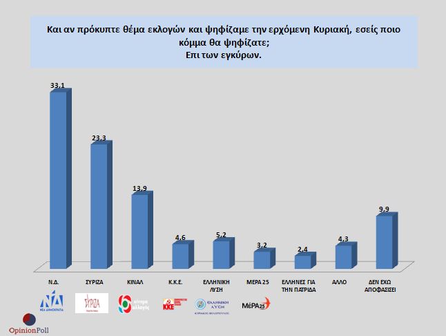 Με την αναγωγή επί των εγκύρων τα αποτελέσματα διαμορφώνονται: Ν.Δ 33.1%, ΣΥΡΙΖΑ 23.3%, ΚΙΝΑΛ 13.9%, Κ.Κ.Ε 4.6%, ΕΛΛΗΝΙΚΗ ΛΥΣΗ 5.1%, ΜΕΡΑ 25 3.2%, ΕΛΛΗΝΕΣ ΓΙΑ ΤΗΝ ΠΑΤΡΙΔΑ 2.4%, ΑΛΛΟ ΚΟΜΜΑ 4.3% και οι Αναποφάσιστοι είναι 9.9%.