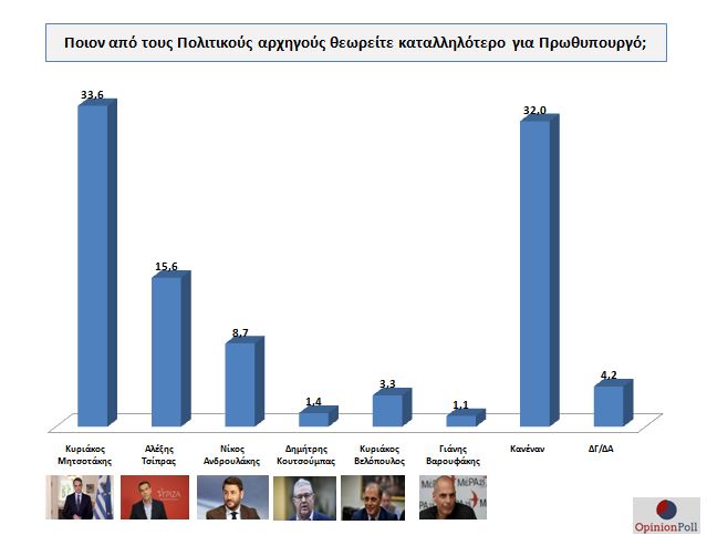 Σύμφωνα με την Πανελλαδική Πολιτική Έρευνα της OPINION POLL για το mononews.gr ο Κυριάκος Μητσοτάκης υπερτερεί με σημαντική διαφορά του Αλέξη Τσίπρα στην καταλληλότητα για Πρωθυπουργός με 33.6% έναντι 15.6% , ενώ την δεύτερη θέση καταλαμβάνει ο Κανένας. Ο Νίκος Ανδρουλάκης επιλέγεται από το 8.7%, ενώ οι άλλοι Πολιτικοί Αρχηγοί συγκεντρώνουν πολύ πιο χαμηλά ποσοστά .