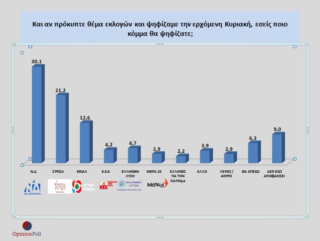 Στην πρόθεση ψήφου η Ν.Δ χάνει 1.1% (σε σχέση με την έρευνα του Φεβρουαρίου) και συγκεντρώνει το 30.1%, ο ΣΥΡΙΖΑ αυξάνει τις δυνάμεις του κατά 1.6% και φτάνει το 21.2%. Η διαφορά παρά την φθορά που δέχεται η Κυβέρνηση είναι της τάξης του 8.9% . Τα υπόλοιπα κόμματα συγκεντρώνουν :ΚΙΝΑΛ 12.5% ( 14.2%), Κ.Κ.Ε 4.2% ( 4.7%) , ΕΛΛΗΝΙΚΗ ΛΥΣΗ 4.7% ( 4%), ΜΕΡΑ 25 2.9% ( 2.6%). Επίσης οι ΕΛΛΗΝΕΣ ΓΙΑ ΤΗΝ ΠΑΤΡΙΔΑ συγκεντρώνουν 2,2%, 3.9% δηλώνει άλλο κόμμα, 2.9% Λευκό/ Άκυρο, 6.3% αποχή και 9% αναποφάσιστοι.