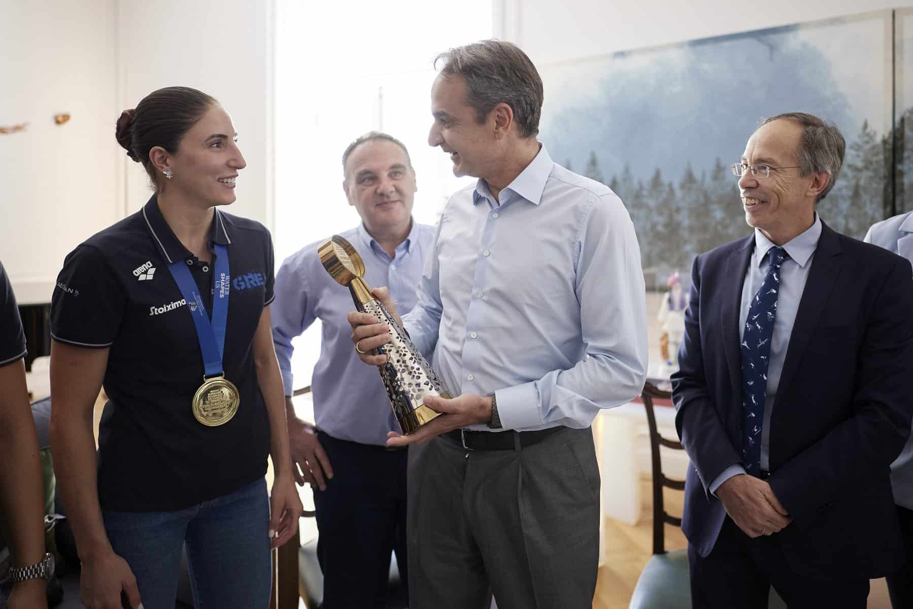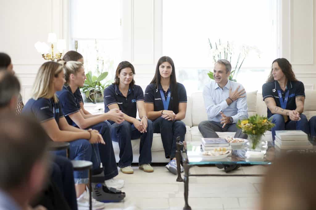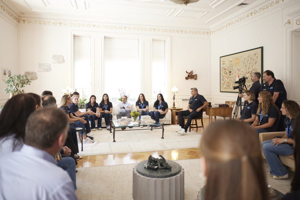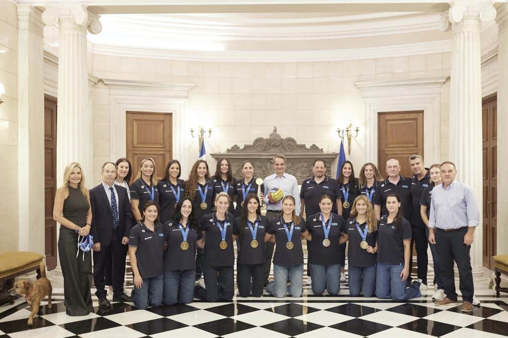 Ο Πρωθυπουργός Κυριάκος Μητσοτάκης και η σύζυγός του Μαρέβα Γκραμπόφσκι – Μητσοτάκη υποδέχτηκαν σήμερα στο Μέγαρο Μαξίμου την εθνική ομάδα πόλο γυναικών, η οποία πριν λίγες ημέρες κατέκτησε το χρυσό μετάλλιο στο Παγκόσμιο Πρωτάθλημα στη Σιγκαπούρη.