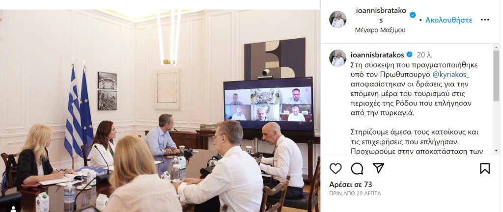 “Στη σύσκεψη που πραγματοποιήθηκε υπό τον Πρωθυπουργό αποφασίστηκαν οι δράσεις για την επόμενη μέρα του τουρισμού στις περιοχές της Ρόδου που επλήγησαν από την πυρκαγιά.