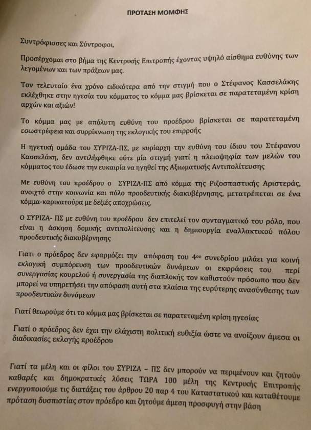 Δείτε το κείμενο της πρότασης μομφής κατά του Στέφανου Κασσελάκη:
