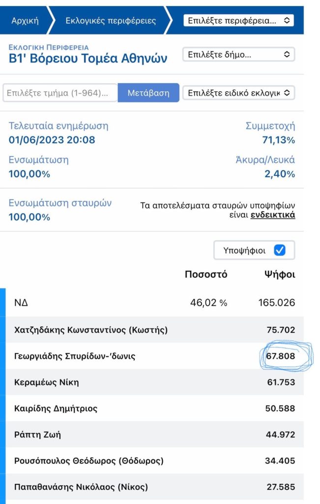 Αγαπητή κα Βασιλοπούλου σας παραθέτω τα επίσημα αποτελέσματα των τελευταίων εκλογών όπου έχω λάβει 67.808 σταυρούς. Θα ήταν κρίμα να διαγράψουμε 4.079 συμπολίτες μου που μου έκαναν την τιμή να με εκλέξουν για πολλοστή φορά βουλευτή τους. Μετά τις εκλογές διαδόθηκε μία φήμη ότι μεταξύ 2019-2023 έχασα πολλές χιλιάδες ψήφων. Η φήμη δεν ανταποκρίνεται στην πραγματικότητα είχα μία ελάχιστη για το ύψος αυτό πτώση μερικών εκατοντάδων σταυρών.