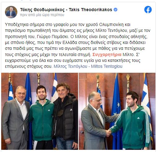 «Υποδέχτηκα σήμερα στο γραφείο μου τον χρυσό Ολυμπιονίκη και παγκόσμιο πρωταθλητή του άλματος εις μήκος Μίλτο Τεντόγλου, μαζί με τον προπονητή του, Γιώργο Πομάσκι. Ο Μίλτος είναι ένας σπουδαίος αθλητής, με σπάνιο ήθος, που τιμά την Ελλάδα στους διεθνείς στίβους και διδάσκει στα παιδιά μας πως πρέπει να αγωνιζόμαστε με πάθος για να πετύχουμε τους στόχους μας μέχρι την τελευταία στιγμή. Συγχαρητήρια Μίλτο. Σ´ ευχαριστούμε για όλα και σου ευχόμαστε υγεία για να κατακτήσεις τους επόμενους στόχους σου».