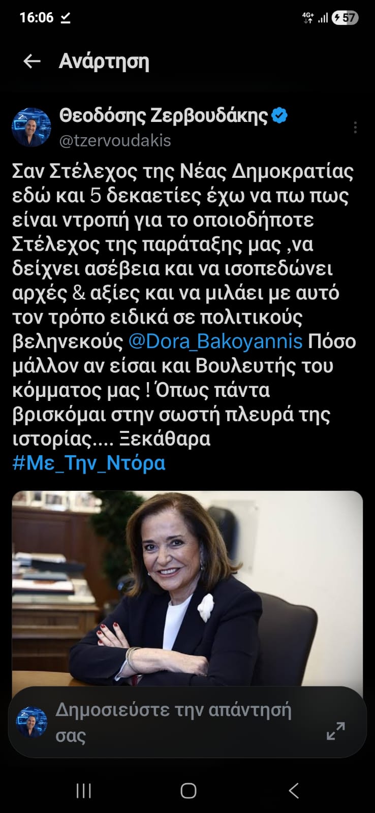 Σαν Στέλεχος της Νέας Δημοκρατίας εδώ και 5 δεκαετίες έχω να πω πως είναι ντροπή για το οποιοδήποτε Στέλεχος της παράταξης μας ,να δείχνει ασέβεια και να ισοπεδώνει αρχές & αξίες και να μιλάει με αυτό τον τρόπο ειδικά σε πολιτικούς βεληνεκούς @Dora_Bakoyannis.