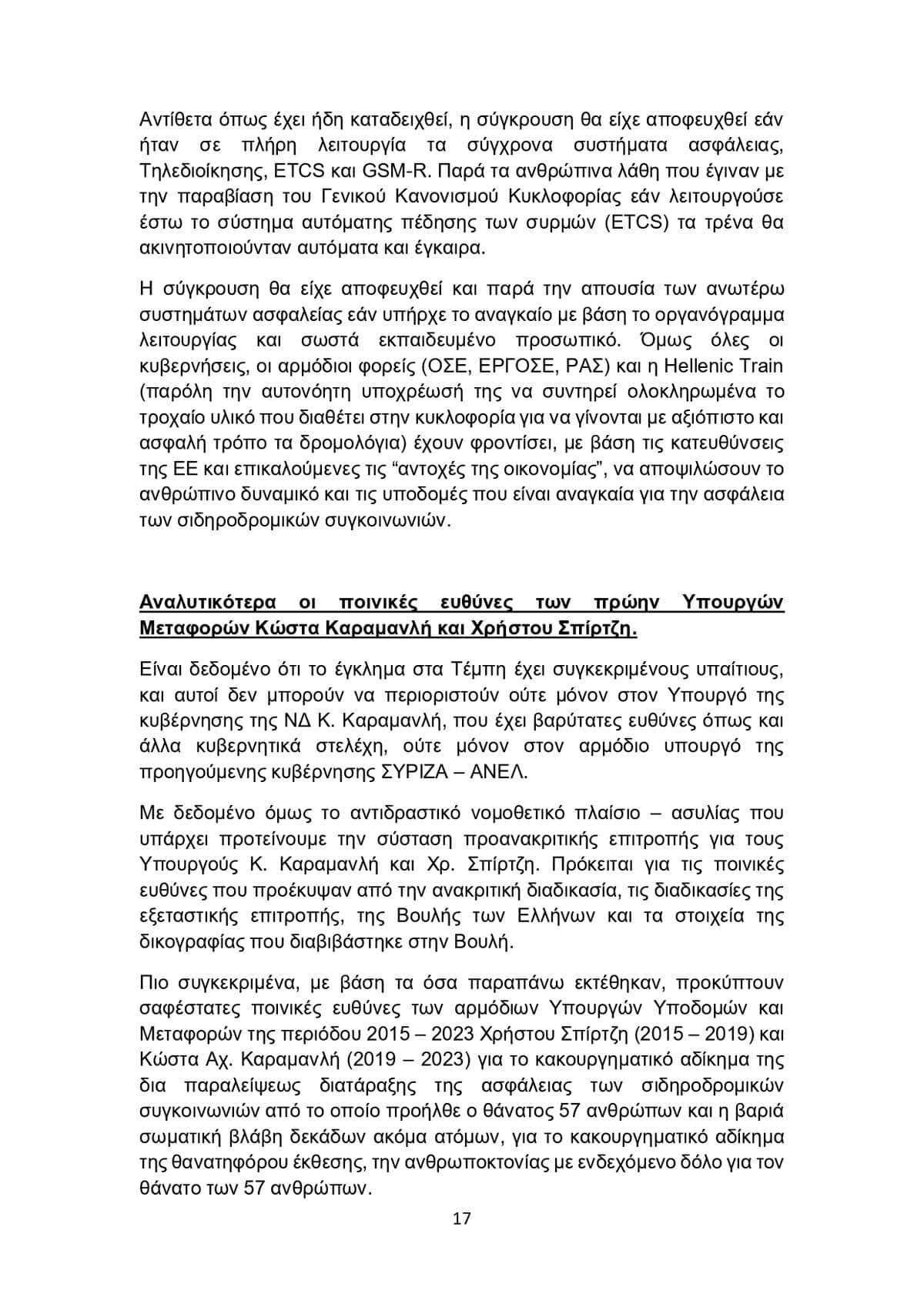 Η πρόταση αφορά τους πρώην υπουργούς Μεταφορών Κ. Καραμανλή και Χρ. Σπίρτζη, για τους οποίους «προκύπτουν σαφέστατες ποινικές ευθύνες» για κακουργηματικού χαρακτήρα αδικήματα.