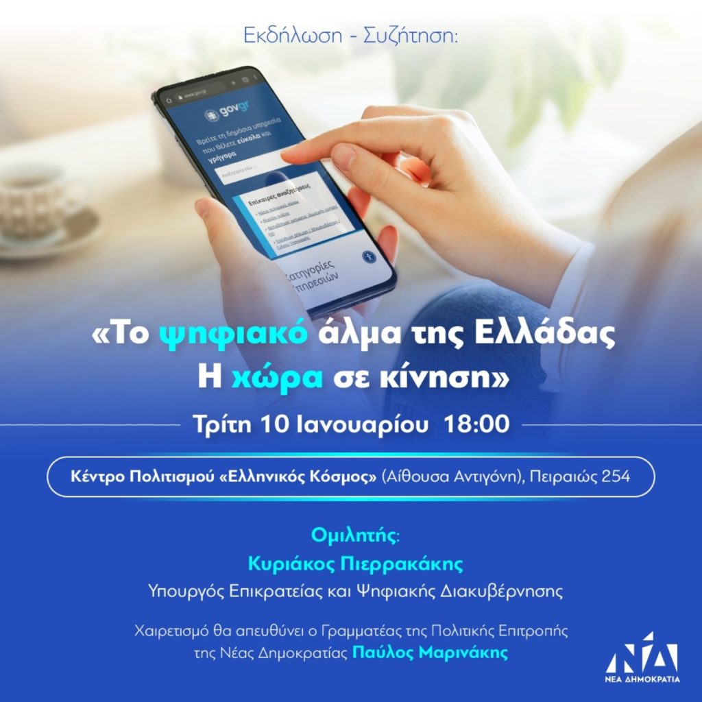 Για το άλμα της Ελλάδα στον τομέα του ψηφιακού μετασχηματισμού και τα επόμενα βήματα της χώρας, θα μιλήσει στην εκδήλωση που διοργανώνει η Νέα Δημοκρατία την Τρίτη 10 Ιανουαρίου, ο Υπουργός Επικρατείας και Ψηφιακής Διακυβέρνησης Κυριάκος Πιερρακάκης. Χαιρετισμό θα απευθύνει ο Γραμματέας της Πολιτικής Επιτροπής της Νέας Δημοκρατίας Παύλος Μαρινάκης.