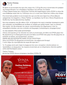 Ενώ οι πληροφορίες που διαρρέουν από την Κουμουνδούρου είναι πως δεν πρόκειται να γίνει καμία συνάντηση ο Παύλος Πολάκης επιμένει πως θα διεξαχθεί κανονικά αύριο στις 12.30 μμ και θα λάβουν μέρος ο Νίκος Φαραντούρης ο Απόστολος Γκλέτσος, η Ράνια Σβίγγου, ο Νίκος Παππάς και ο Θάνος Μωραΐτης.
