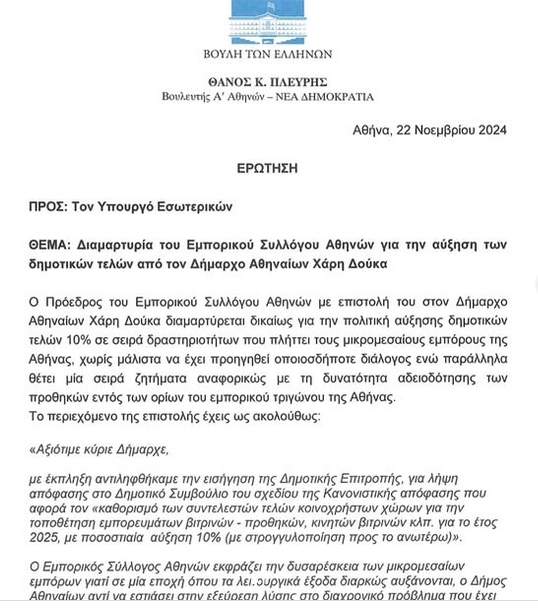 Ερώτηση στη Βουλή προς τον υπουργό Εσωτερικών, με θέμα την αύξηση των δημοτικών τελών από τον δήμαρχο Αθηναίων, Χάρη Δούκα, κατέθεσε ο κοινοβουλευτικός εκπρόσωπος της ΝΔ, Θάνος Πλεύρης.