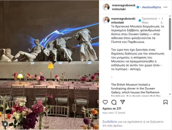 Την έντονη δυσαρέσκειά της εξέφρασε, μέσω ανάρτησής της στο Instagram, η Μαρέβα Γκραμπόφσκι – Μητσοτάκη, για την πρωτοβουλία του Βρετανικού Μουσείου να διοργανώσει φιλανθρωπικό δείπνο στην Duveen Gallery, τον χώρο όπου φυλάσσονται τα Γλυπτά του Παρθενώνα.