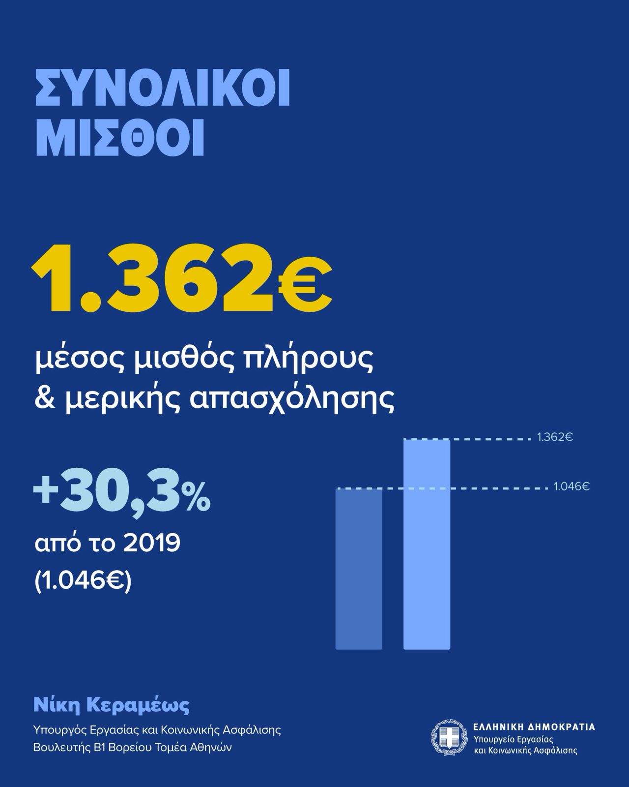 *Ο μέσος μισθός πλήρους και μερικής απασχόλησης αυξήθηκε στα 1.362,66 ευρώ από τα 1342 ευρώ το 2024. Συνολικά, από το 2019, η αύξηση του μέσου μισθού είναι 30,3% (1.362.66 ευρώ έναντι 1.046 ευρώ).