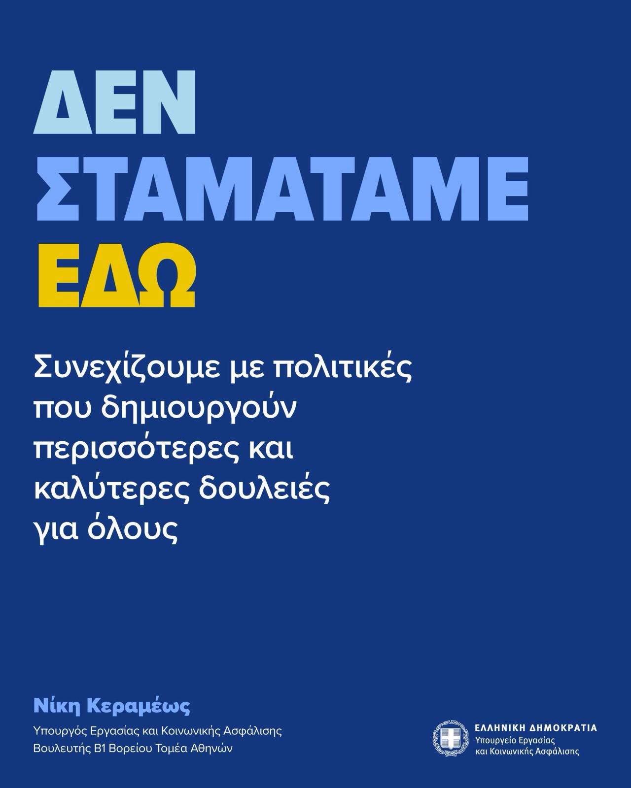 Η Υπουργός Εργασίας και Κοινωνικής Ασφάλισης Νίκη Κεραμέως δήλωσε: «Η πολιτική μας για τα ζητήματα της εργασίας και οι δράσεις μας για την αύξηση της απασχόλησης και την ενίσχυση του διαθέσιμου εισοδήματος των πολιτών αποδίδουν απτά, άμεσα, θετικά αποτελέσματα. Το 2026 συνεχίζουμε την προσπάθεια για τη δημιουργία ολοένα και περισσότερων, και πιο ποιοτικών, θέσεων απασχόλησης. Με κάθε πρωτοβουλία και κάθε δράση μας, θέλουμε να είμαστε αποτελεσματικοί και χρήσιμοι στους πολίτες».