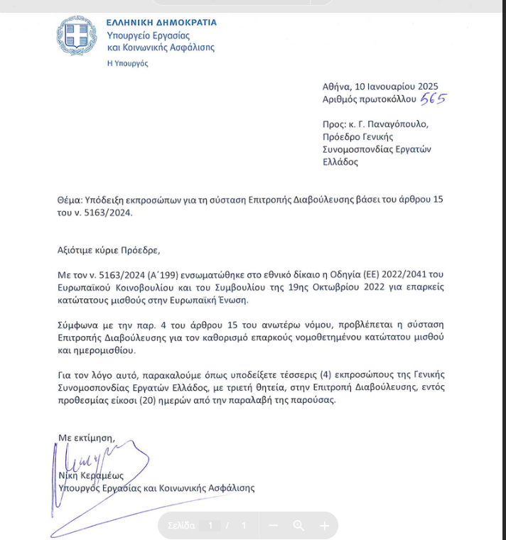 Ενώ την Παρασκευή 24 Ιανουαρίου 2025 η Γ.Σ.Ε.Ε. έστειλε στην Υπουργό Εργασίας και Κοινωνικής Ασφάλισης, Νίκη Κεραμέως, τα ονόματα των τεσσάρων μελών της που θα συμμετείχαν στη ενδεκαμελή επιτροπή, σήμερα, την αμέσως επόμενη εργάσιμη ημέρα, με επιστολή της προς τον Πρόεδρο του ΟΜΕΔ, Κώστα Παπαδημητρίου, ενημερώνει για την «ομόφωνη απόφασή της να μην συμμετάσχει στις εργασίες της Επιτροπής Διαβούλευσης για τον καθορισμό του κατώτατου μισθού το 2025».