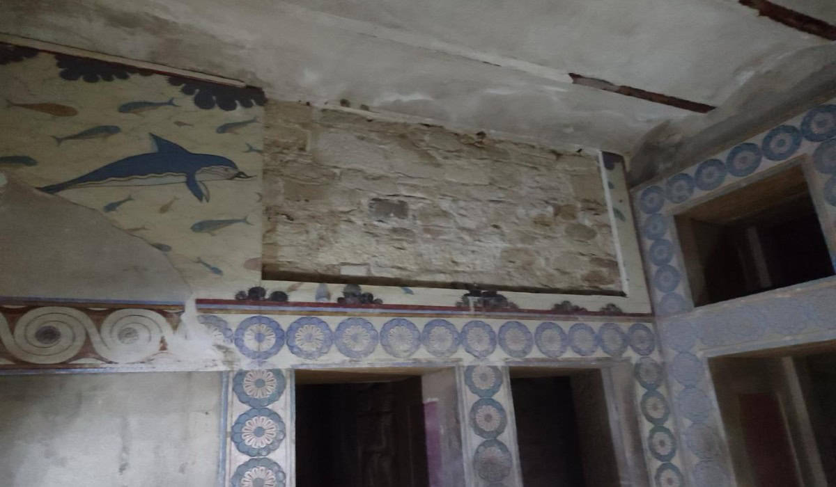 «Η Εφορεία Αρχαιοτήτων Ηρακλείου χτες το βράδυ ολοκλήρωσε την συλλογή και την απομάκρυνση των θραυσμάτων του αντιγράφου, του 1960, της τοιχογραφίας των Δελφινιών -το πρωτότυπο της οποίας εκτίθεται στο Αρχαιολογικό Μουσείο Ηρακλείου- από τα λεγόμενα «διαμερίσματα της βασίλισσας», στην Κνωσσό». Σύμφωνα με την ανακοίνωση του ΥΠΠΟ, που πληροφορεί τα παραπάνω, «η τοιχογραφία αποκολλήθηκε, χθες, το απόγευμα εξ αιτίας των θυελλωδών ανέμων που έπνεαν στην περιοχή. Λόγω των δυσμενέστατων καιρικών συνθηκών διεκόπη προσωρινά και η λειτουργία του αρχαιολογικού χώρου».