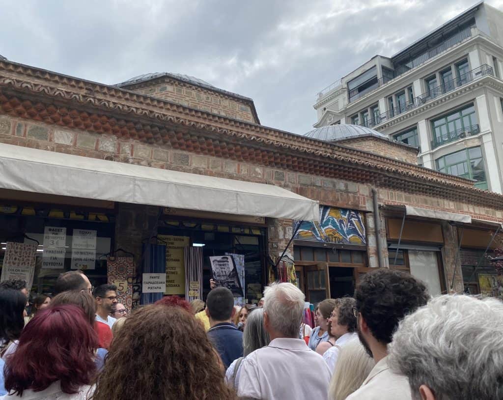 Η διαδρομή ξεκίνησε από την αγορά Καπάνι ή Αγορά Βλάλη, την παλαιότερη παραδοσιακή αγορά της πόλης. Εκεί, λίγα μέτρα από την Εγνατία, το σκηνικό άλλαξε, μεταφέροντας τους επισκέπτες σε έναν διαφορετικό κόσμο, με δικούς του ρυθμούς και ατμόσφαιρα. Η ξεναγός Χριστίνα Μαβίνη εξήγησε ότι η αγορά αυτή διασώθηκε χάρη στο πολεοδομικό σχέδιο του Ερνέστ Εμπράρ, μετά τη μεγάλη πυρκαγιά του 1917, όταν η Επιτροπή Αποκατάστασης επέλεξε να διατηρήσει παραδοσιακούς εμπορικούς πυρήνες στο κέντρο της πόλης. Η ίδια η ονομασία του χώρου από το «ουν καπάν», παραπέμπει στην αλευραγορά της οθωμανικής περιόδου, ενώ ιστορικά οι συντεχνίες, όπως οι μυλωνάδες, οι τσαγκάρηδες, οι αρωματοπώλες, ήταν κατανεμημένες σε συγκεκριμένα σημεία.