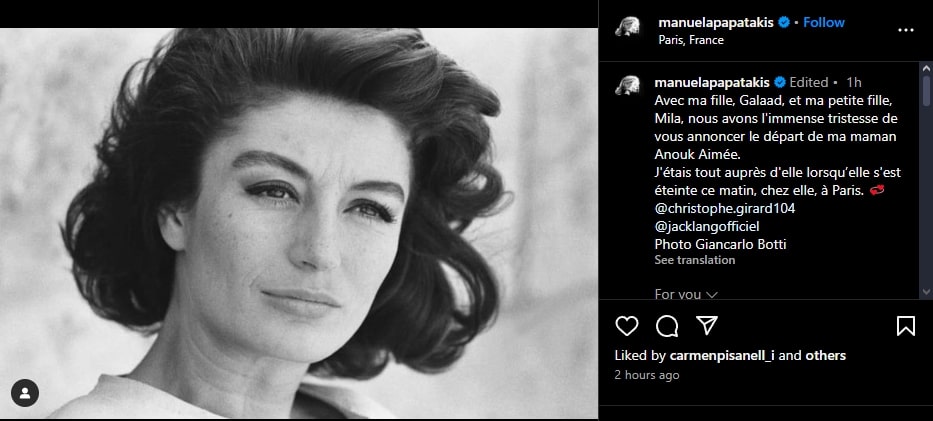Η Μανουέλα Παπατάκη, η κόρη της Ανουκ Εμέ και του σκηνοθέτη και σεναριογράφου Νίκου Παπατάκη, γνωστοποίησε επίσης το θάνατό της εκφράζοντας την «απέραντη θλίψη» της στον λογαριασμό της στο Instagram.