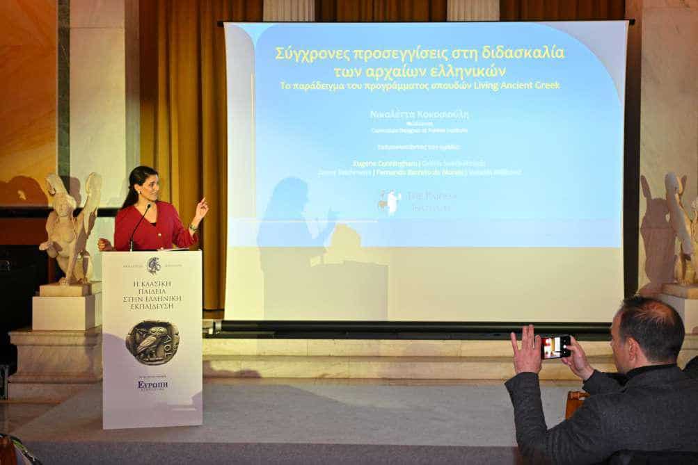 Ο Χριστόφορος Χαραλαμπάκης (Ακαδημαϊκός) αναφέρθηκε στην ενδυνάμωση της κλασικής παιδείας στα σχολεία, ο Mauro Agosto (Pontificia Università Lateranense) παρουσίασε την επιτυχημένη εμπειρία των Κλασικών Λυκείων στην Ιταλία, ενώ ο Steven Hunt (University of Cambridge) και ο Joseph Conlon (Ralston College) αναφέρθηκαν στις καινοτόμες διδακτικές προσεγγίσεις που εφαρμόζονται στο εξωτερικό για τη διδασκαλία των Αρχαίων Ελληνικών. Η Μαρία Ευθυμίου (ΕΚΠΑ) επισήμανε τη διαχρονική αξία της ελληνικής γλώσσας και την επίδρασή της στην ανάπτυξη της δυτικής σκέψης, ενώ ο Γιάννης Καργάκος (Αρσάκεια Σχολεία) αναφέρθηκε στις προκλήσεις του ελληνικού εκπαιδευτικού συστήματος. Η Σοφία Γούλα (Ελληνική Αγωγή) παρουσίασε τις βιωματικές μεθόδους διδασκαλίας στα παιδιά του Δημοτικού, ενώ η Γεωργία Ξανθάκη – Καραμάνου (Πανεπιστήμιο Πελοποννήσου) παρουσίασε προτάσεις για την αναβάθμιση της κλασικής παιδείας σήμερα. Ο Ευάγγελος Αλεξίου (ΑΠΘ) τόνισε τη σημασία της διδασκαλίας των αρχαίων κειμένων και της σύνδεσης των αρχαίων συγγραφέων με τη σύγχρονη σκέψη. Η Νικολέττα Κοκοσιούλη, φιλόλογος και εκπρόσωπος του Paideia Institute, παρουσίασε τις σύγχρονες μεθόδους διδασκαλίας των Αρχαίων Ελληνικών, επισημαίνοντας τη σημασία της βιωματικής προσέγγισης για την εμπέδωση της γλώσσας στους μαθητές. Ο Γιάννης Μαστρογεωργίου μίλησε για την κλασική παιδεία στην εποχή της Τεχνητής Νοημοσύνης, ενώ ο Giorgio Filieri από τη Στερνατία, ένα από τα ελληνόφωνα χωριά της κάτω Ιταλίας, μίλησε για τη διάλεκτο Griko και τη σημασία της διατήρησης αυτής της ζωντανής γλωσσικής κληρονομιάς, η οποία συνδέει τις σύγχρονες ελληνικές κοινότητες με την αρχαία Ελλάδα και την παράδοση.