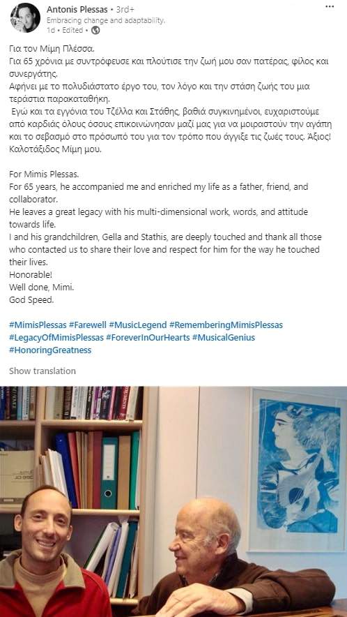 «Αφήνει με το πολυδιάστατο έργο του, τον λόγο και την στάση ζωής του μια τεράστια παρακαταθήκη. Εγώ και τα εγγόνια του Τζέλλα και Στάθης, βαθιά συγκινημένοι, ευχαριστούμε από καρδιάς όλους όσους επικοινώνησαν μαζί μας για να μοιραστούν την αγάπη και το σεβασμό στο πρόσωπό του για τον τρόπο που άγγιξε τις ζωές τους. Άξιος! Καλοτάξιδος Μίμη μου», καταλήγει ο Αντώνης Πλέσσας.
