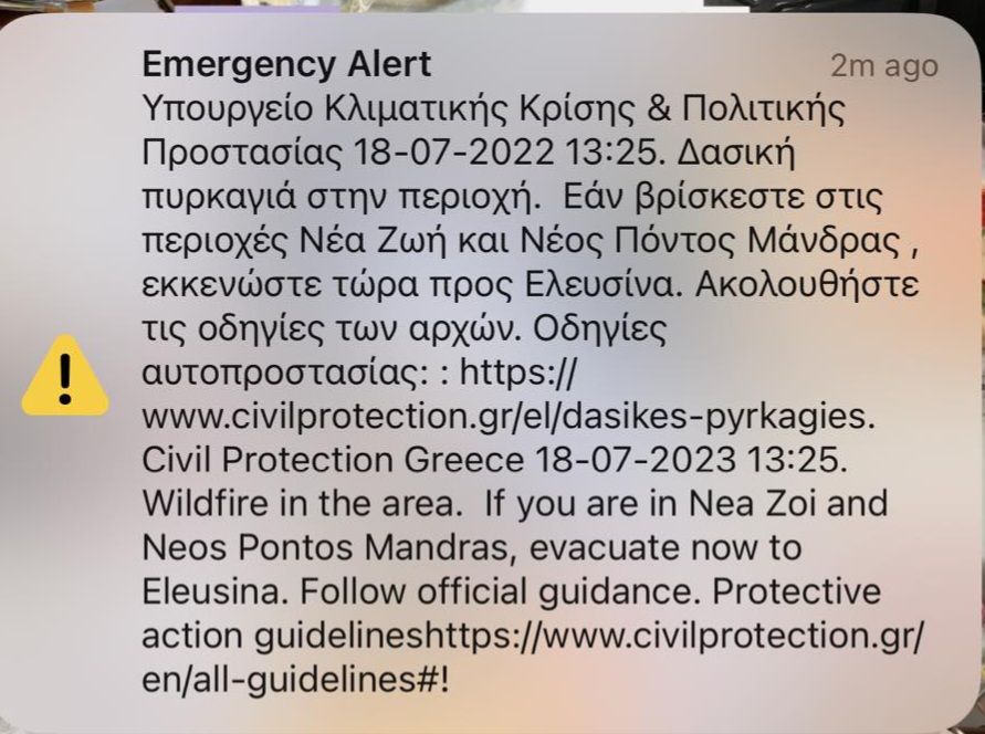 Νέο μήνυμα από το 112 ήχησε στα Δερβενοχώρια, λόγω της φωτιάς που μαίνεται ακόμα στην περιοχή. Το μήνυμα έλαβαν και οι κάτοικοι της Αττικής.