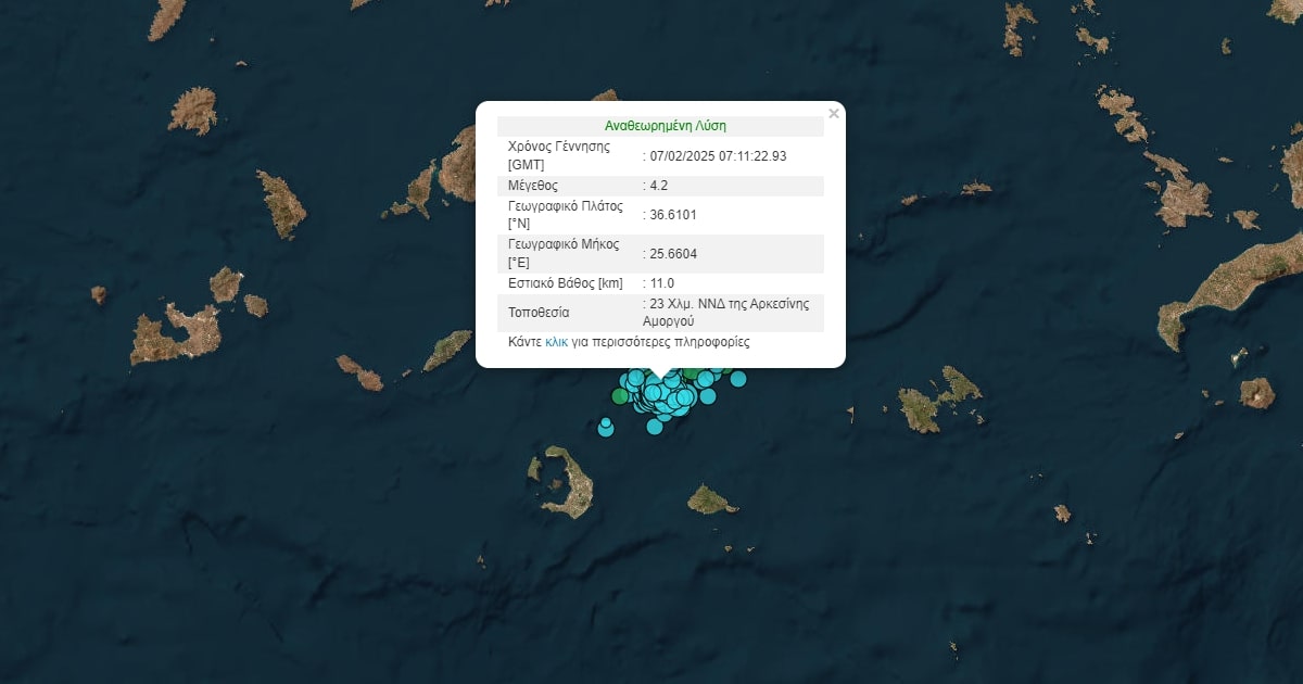 Σύμφωνα με το Γεωδυναμικό Ινστιτούτο, το επίκεντρο του σεισμού εντοπίζεται 27 χλμ. ΑΒΑ της Οίας, ενώ το εστιακό βάθος υπολογίζεται στα 12,3 χλμ.