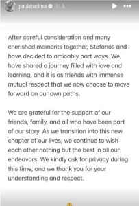 «Ύστερα από προσεκτική σκέψη και πολλές όμορφες στιγμές μαζί, ο Στέφανος και εγώ αποφασίσαμε να χωρίσουμε φιλικά τους δρόμους μας. Μοιραστήκαμε ένα ταξίδι γεμάτο αγάπη και μάθηση, και ως φίλοι με τεράστιο αμοιβαίο σεβασμό επιλέγουμε τώρα να προχωρήσουμε στα δικά μας μονοπάτια. Είμαστε ευγνώμονες για την υποστήριξη των φίλων μας, της οικογένειάς μας και όλων όσοι υπήρξαν μέρος της ιστορίας μας. Καθώς μεταβαίνουμε σε αυτό το νέο κεφάλαιο της ζωής μας, συνεχίζουμε να ευχόμαστε ο ένας στον άλλον μόνο το καλύτερο σε όλες τις προσπάθειές μας. Ζητάμε ευγενικά την προστασία της ιδιωτικής μας ζωής κατά τη διάρκεια αυτής της περιόδου και σας ευχαριστούμε για την κατανόηση και τον σεβασμό σας».