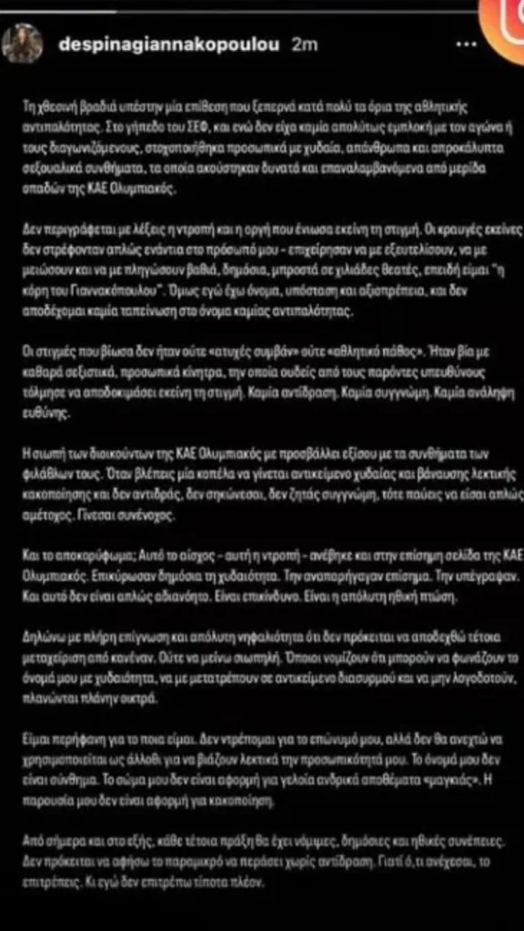 «Τη χθεσινή βραδιά υπέστην μία επίθεση που ξεπερνά κατά πολύ τα όρια της αθλητικής αντιπαλότητας. Στο γήπεδο του ΣΕΦ, και ενώ δεν είχα καμία απολύτως εμπλοκή με τον αγώνα ή τους διαγωνιζόμενους, στοχοποιήθηκα προσωπικά με χυδαία, απάνθρωπα και απροκάλυπτα σεξιστικά συνθήματα, τα οποία ακούστηκαν δυνατά και επαναλαμβανόμενα από μερίδα οπαδών της ΚΑΕ Ολυμπιακός.